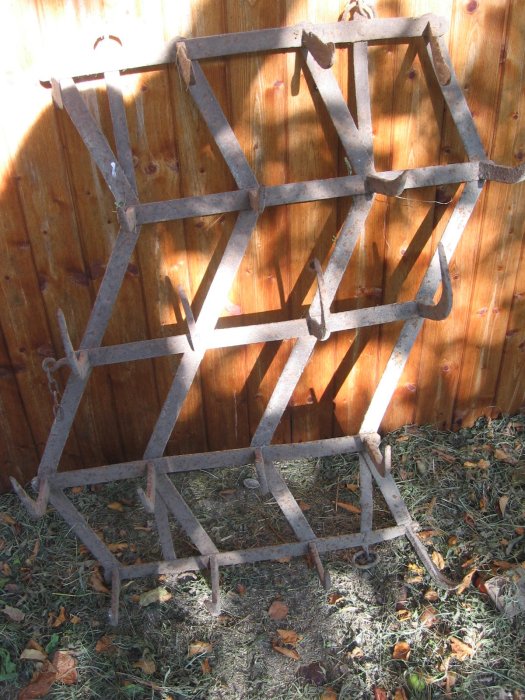 nabízím 1x bránu delší hroty je potřeba ji srovnat je přihnutá 400kč,hrobkovač ,možnost výškového nastavení pluhu u kolečka páčka nefunkční 2700kč,závěs z řetízky délka 125cm, 1000kč,rám na brány 2500kč, nabízím i staré značené sekery a krumpáč cenu nabídněte