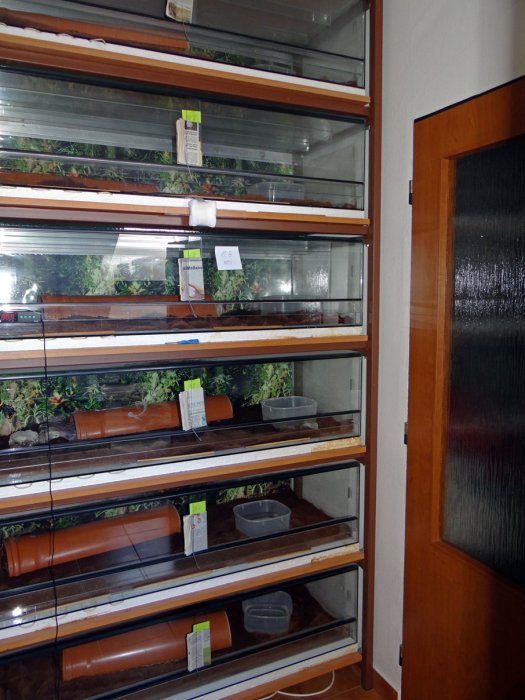 6 terárií - šířka 120 cm, hloubka 50 cm, výška 30 cm. Základna sklo tloušťky 6 mm, boky, záda a strop 5 mm, dvířka 3 mm.