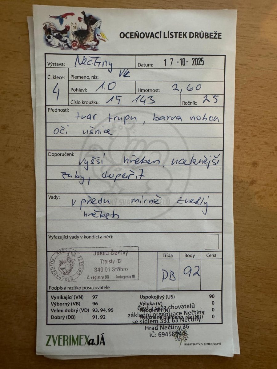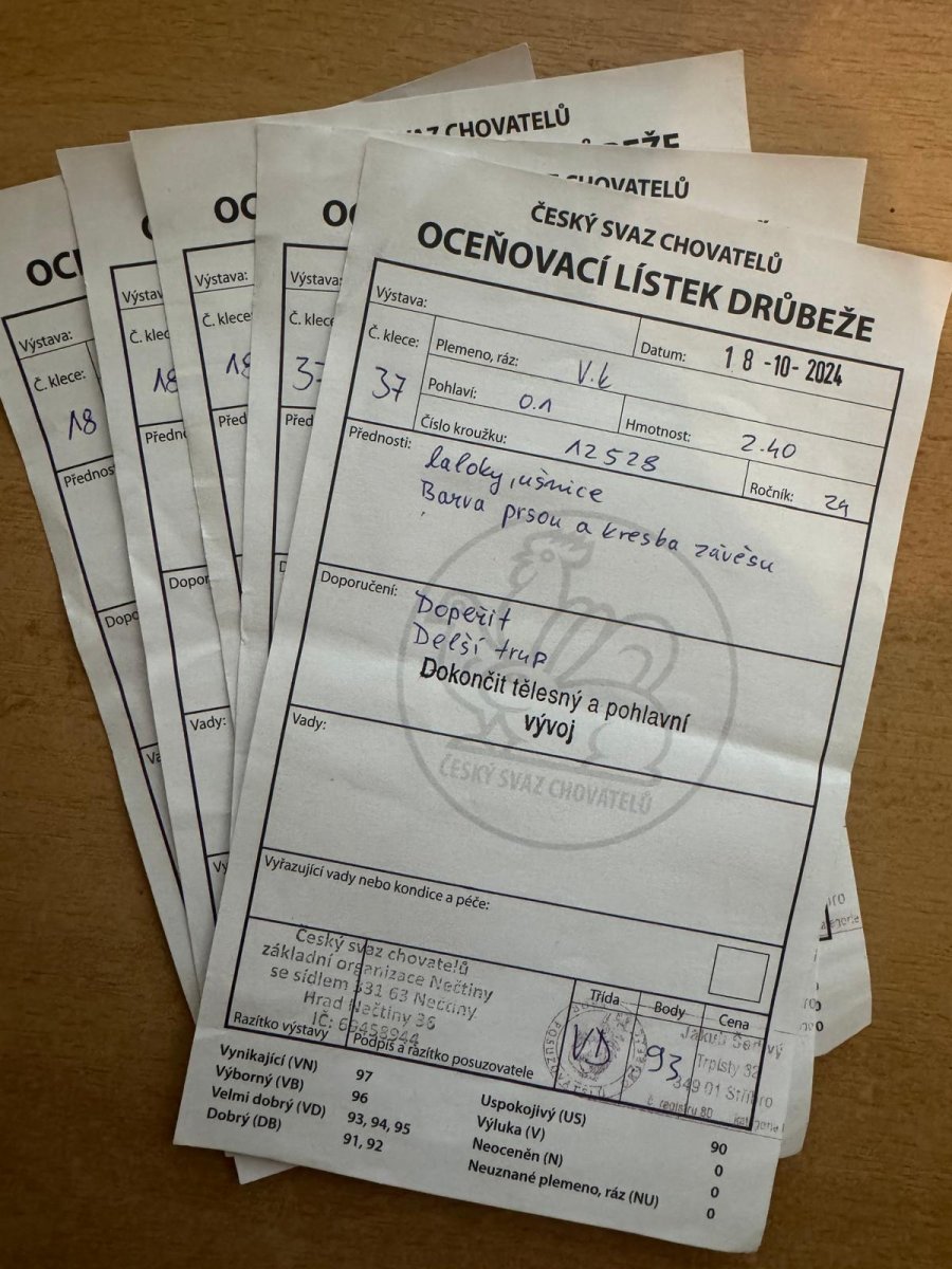 V obrázcích přikládám oceňovací lístky drůbeže z výstavy Českého svazu chovatelů. Lístky z roku 2024 jsou kohout a slepice (nepříbuzní - pořízeno od různých chovatelů, konkrétně Bayer a Fialka). Z tohoto chovu jsem si na jaře loňského roku vylíhl novou generaci slepic a poté vyměnil kohouta za nepříbuzného, jehož přiložený oceňovací lístek je tedy z roku 2025). U vajec je tedy zajištěna nepříbuznost rodičů. Předci vajec navíc prošli výstavou. Nelze pochybovat o čistokrevnosti a kvalitě rodičů vajec.