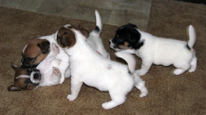 Hladkosrstá štěňátka Jack Russell teriéra s PP k rezervaci – 3 pejsci a 2 fenky – k odběru v březnu