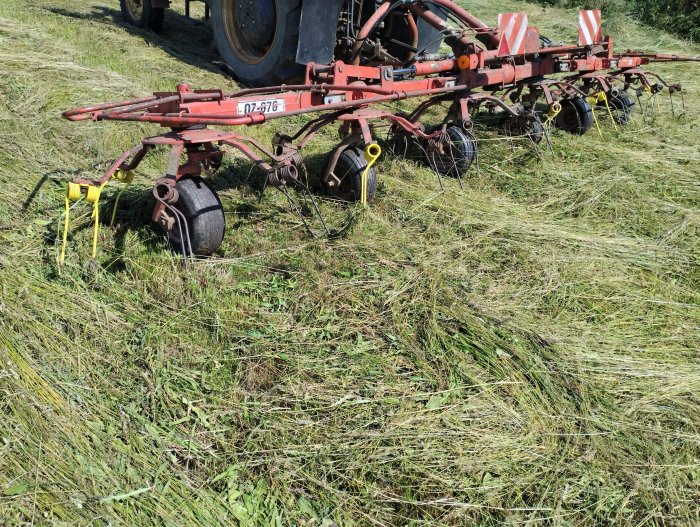 Obraceč píce Rozmital OZ-676, 6 rotorů, na rotoru 6 ramen, pracovní záběr 6,7 m, amortizační tyče, natočení pojezdových kol pro boční odhoz píce na okraji pozemku, plně funkční, udržovaný a zachovalý stroj, technické osvěčení