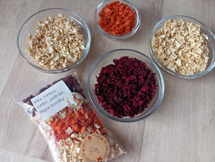 nabízím sušenou zeleninu mrkev,celer,petržel,řepa kostky,vše baleno po 50g, cena za jeden pytlíček 50g 50,-