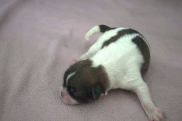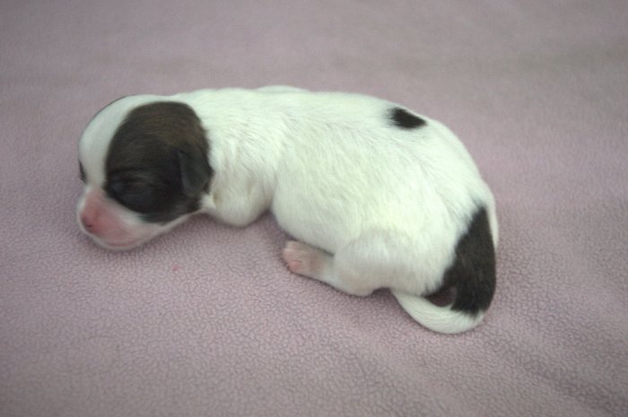 Tatínek Efekt Lucy´s Secret je particolor pejsek s testy PRA3 čisté, patelly 0/0, řezáky 6/6