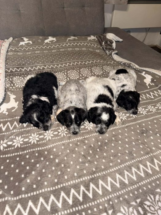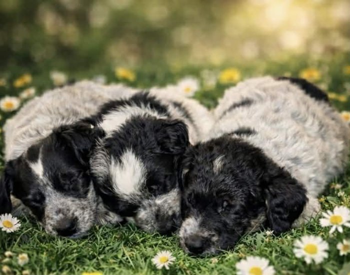 Máme krásná štěňátka po mamince border kolii merle a tatínkovi, který je také merle a křížený s neznámým plemenem. Štěňátka mají 8 týdnů a jsou hravá, mazlivá a zvyklá na kontakt s lidmi. Jejich zbarvení je velmi zajímavé převládá modrá (blue merle) a stříbrná barva v kombinaci s černými skvrnami a jemnými hnědými znaky. Mají flekaté tlapky a některá i tmavší hlavičku se světlejším tělíčkem, což jim dodává jedinečný vzhled.
