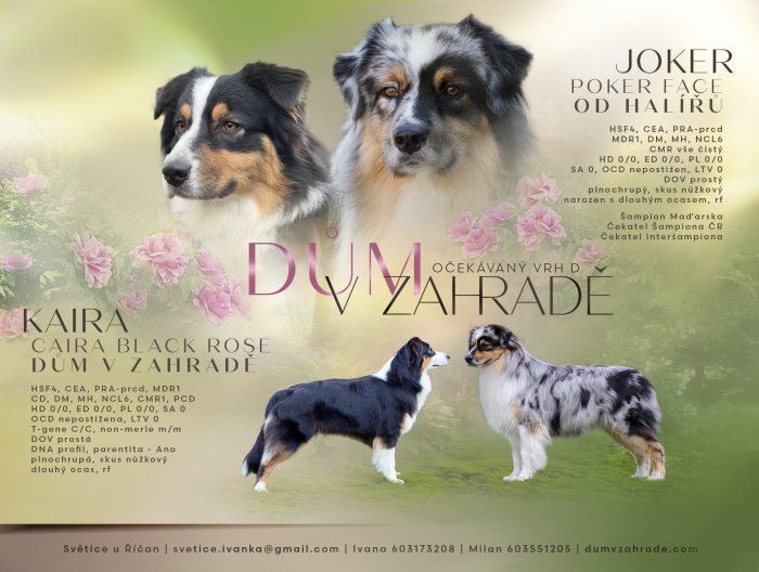 V naší rodinné CHS Dům v zahradě se těšíme na vrh D z výborného spojení (viz foto). Štěňata budou k odběru poslední týden v červenci. Podrobné informace na dumvzahrade.com