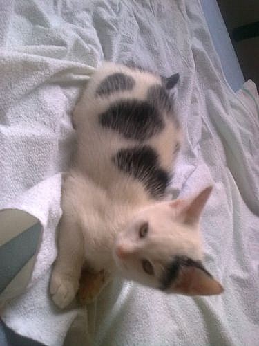 Maličký Jupík, roztomilý bílý kocourek s černým ocáskem a několika černýma flíčkama přišel ke mně se sourozenci ze stáje, kde jim hrozilo usmrcení. Je z koťat největší a nejmazlivější. Moc rád se mazlí, nechává si drbat bříško a vrní o život. Dobře papá, je hravý a rychle se naučil používat kočičí záchůdek.rnHledáme pro něj bezpečný domov bez možnosti výběhu ven, nejlépe s nějakým kočičím kamarádem. Tak malému kotěti by bylo samotnému smutno. Je zvyklý i na psy. Nejlépe by mu bylo s některým sourozencem Jolankou nebo Joly. rnJupík na Vás čeká v bytě v Praze. Je očkovaný a odčervený. Kontakt: Dáša M. tel: 602 266 803rne- mail: srobovad@seznam.czrn