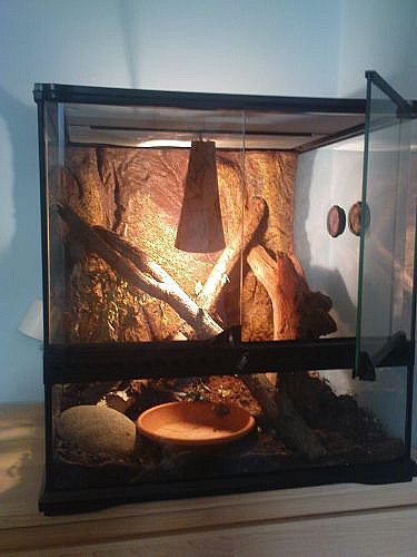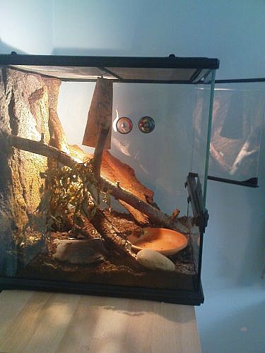 Prodám Terárium 45x45x45 nepoužité zařízené misky teploměr, vlhkoměr, 2 žárovky, kmeny, knížka o chovu,tel 723928726