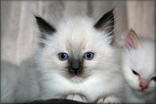 Dvě britská koťata bez PP, obě holčičky. První krátkosrstá bílá colorpoint s modrýma očima, druhá krátkosrstá červená s kresbou. Máme z nich radost, neboť jde...