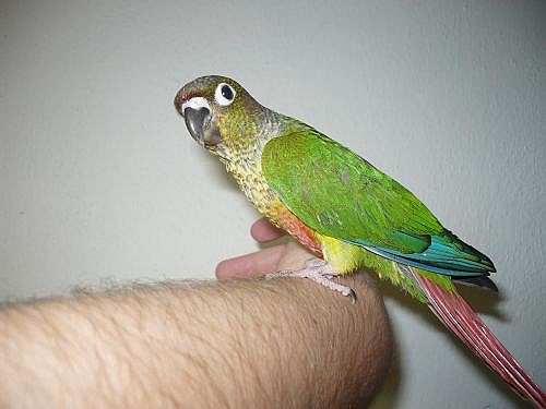 Nabízím ručně dokrmené mládě pyrury žlutoprsého. Krotké mládě s pevným letošním kroužkem. 737606121