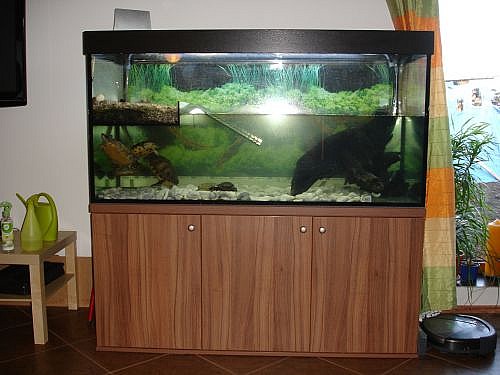 Věnuji jen do dobrých rukou z rodinných důvodů pět vodních želv. Zdravé a aktivní.rn1.želva nádherná 10 let samice, 20cmrn2.želva žlutolící 3 roky, samice 20cmrn3.želva mapová 8 let, samec 15cmrn4.želva krásná 3 roky, samec 13cmrn5.klapavka 2 roky, neurčeno pohlaví, 9cm rnK tomu prodám akvarijní komplet: rnAkvárium 150d x 60h x 76v, zabudovaná pláž pro slunění, v rohu díra pro filtraci. Objem vody po pláž 360l, celkově 675l (PC 7500Kč). Vlepen digitální teploměr.Záruka do 2/2015 rnOsvětlovací kryt v černé barvě Mabo Standart 150dx60hx8v Pro 2 zářivky(PC4520Kč)rnZářivka exoterra - prošlé UVA, jinak funkčnírnZářivka Sunglo 40W/120cmrnPodložka pod akvárium 6mmrnTopné těleso Fluval M 300W(PC550Kč)rnVnější filtrace zn. Atman CF-1000, průtok 600l/h. Záruka do 2/2013. (PC 2270)rnOkrasný kořen z plaveného dřevarnAkvarijní pozadí - viz foto + oblázky, břidlicirnSkříň pod akvárium ořech 151dx71vx60h rn(PC 5000Kč) uzpůsobená pro umístění venkovního filtru v prvním segmentu, další dva oddíly s policemi. rnPůvodní cena celkově 22.000KčrnNyní 14.000Kč, možná dohodarn