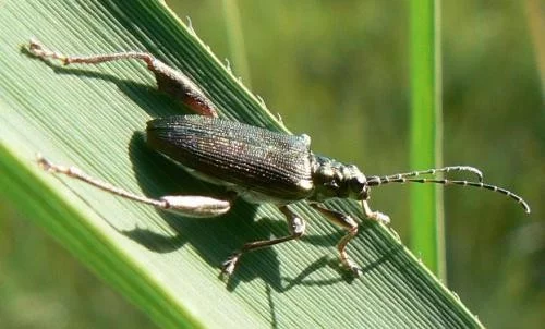 Rákosníček nohatý nebo též tlustonohý se vyskytuje v rybničnatých krajinách, kde rostou ve vodě lekníny. Na jejich plovavých listech se brouci, 9 až 11 milimetrů velcí, zdržují. Ale najdete je i na jiných vodních rostlinách nad hladinou.