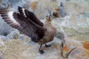 Staří ptáci krmí mláďata zpočátku polostrávenými sousty. Mladí zůstávají několik dní v hnízdě, pak sedají obvykle v blízkosti a rychle a obratně běhají. Jakmile se objeví vetřelec, vyhledávají úkryt mezi kameny nebo ve vegetaci. Jejich dlouhé husté prachové peří je nahoře hnědé, dole bledě žluté. Polovzrostlá mláďata se začínají živit bobulemi, které rostou v obvodu kolonie. Začátkem srpna dovedou už létat, zůstávají ale až do konce září v blízkosti hnízdiště. Kořist loví chaluhy střemhlavým letem a údery zobáku.