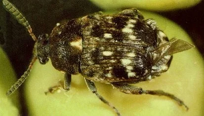 Dospělý brouk je tmavý, konec těla je světlý s dvěma tmavými skvrnami. Velikost je 4-5 milimetrů. Larva je běložlutá s tmavou hlavou, velikost 5-6 milimetrů.