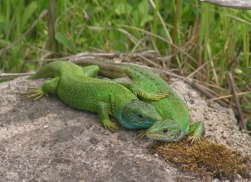 Ještěrka zelená se u nás vyskytuje jen na jižní Moravě, v Čechách v kaňonech Vltavy a Berounky a na Labi, obvykle na skalnatých místech, také na vinicích či v opuštěných pískovnách. Dorůstá kolem 30 centimetrů délky, na jihu Evropy však až 50 centimetrů. V jarní době samci mezi sebou svádějí urputné souboje a mnohdy přijdou o ocas. Ten jim však za několik týdnů zase doroste.