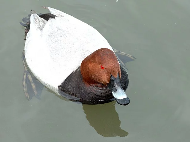 Délka 46 cm. Ve svatebním šatě je sameček nezaměnitelný díky rezavě červené hlavě a krku, šedému hřbetu, černé hrudi a bílým bokům. V prostém šatu jsou bezpečnými rozpoznávacími znaky ohnivě červené oko a černý zobák s modrošedým příčným pruhem. Nenápadně hnědavá samice má podobný, ale nezřetelný proužek na zobáku. Její oči jsou hnědé, v době hnízdění výrazněji zbarvené. Zblízka činí její opeření na hřbetě dojem příčných vlnek. Poláci velcí nejsou příliš dobří letci. Z hladiny vzlétají po krátkém a mohutném rozběhu. Jen zřídka se objevují na souši.